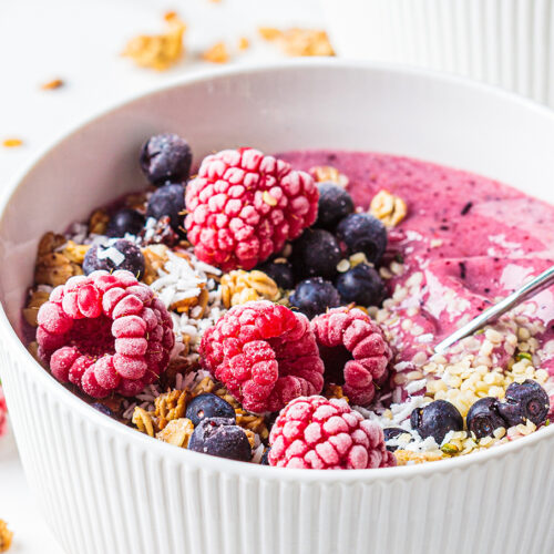 Creamy yoghurt blends harmoniously with a mix of frozen berries, topped with a vibrant array of wholesome ingredients for a nutritious and energising start to your day.