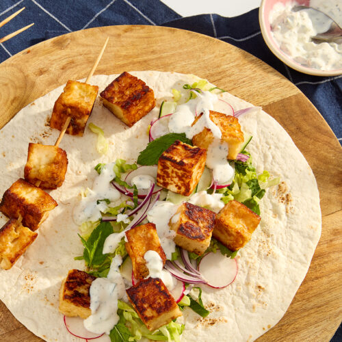 Spread a tablespoon of tzatziki or yoghurt dressing onto each tortilla or flatbread.