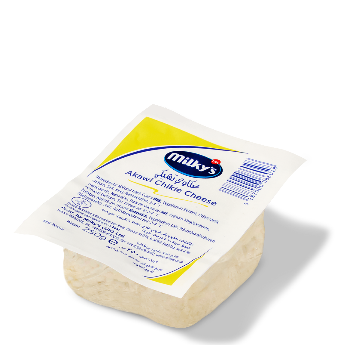 A smooth textured cheese, naturally salty due to its brine-curing process. Akawi Chikie Cheese pairs well with a wide range of dishes – eaten on its own, with fresh bread and olives, or when baked, it turns deliciously stringy and melts – ideal for pizzas, pasta dishes, or hearty vegetarian bakes.
